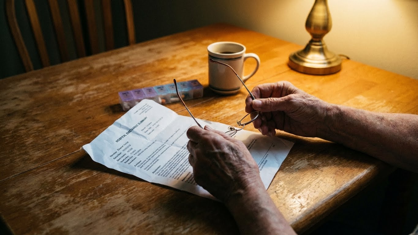 (Image Suggestion: A close-up of an older pair of hands holding a pair of glasses, resting on a table with a hospital discharge paper. The lighting is dim/kitchen table setting.)